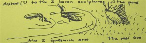 I liked the curve of the pond edge. The contrast between artificial and real. Also when I was in college, I had a drawing teacher who would point to something in my drawing and say, “If you went into a shape shop, would you buy that shape?” It sounds kind of silly, but I still ask myself that question.