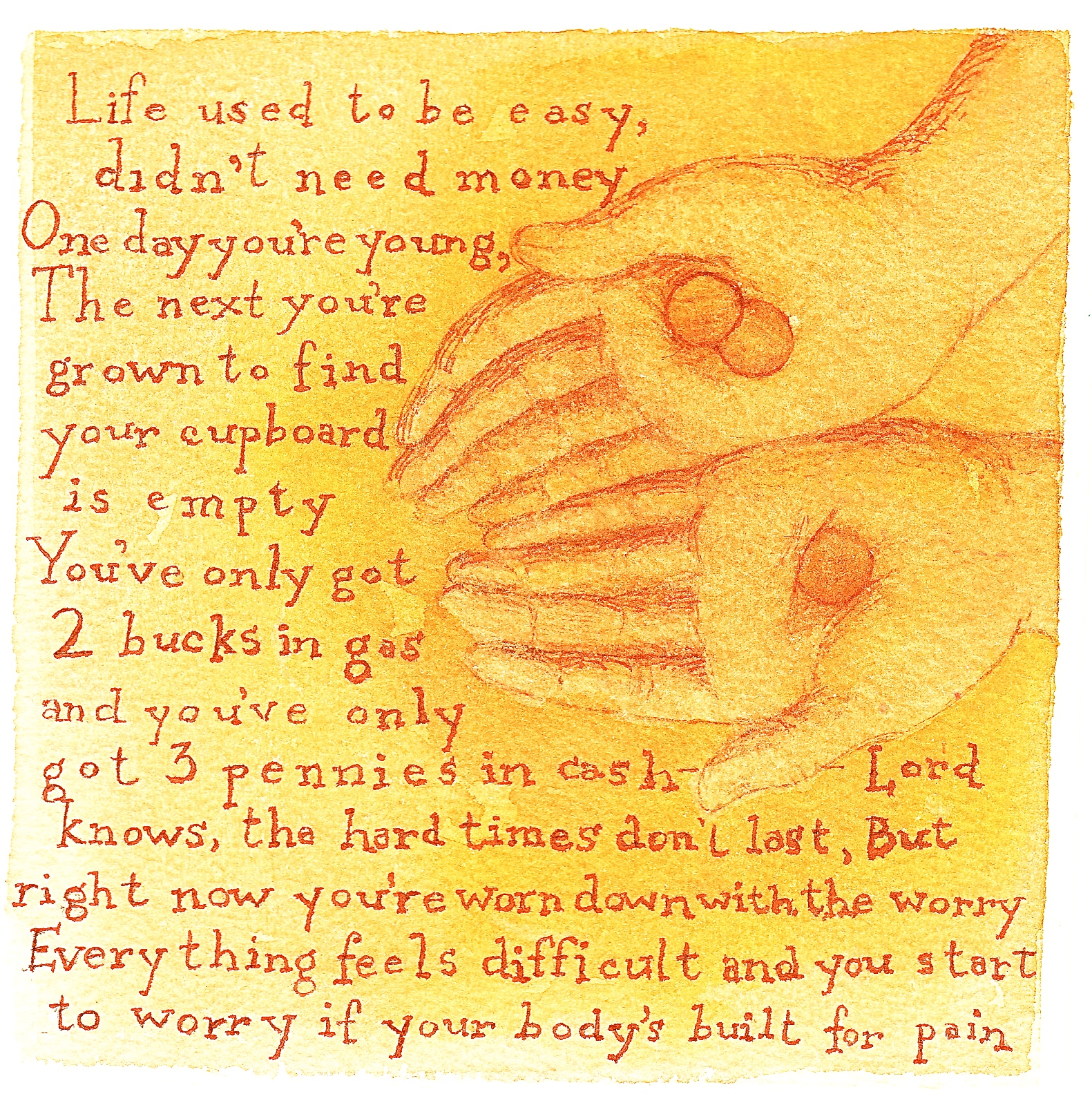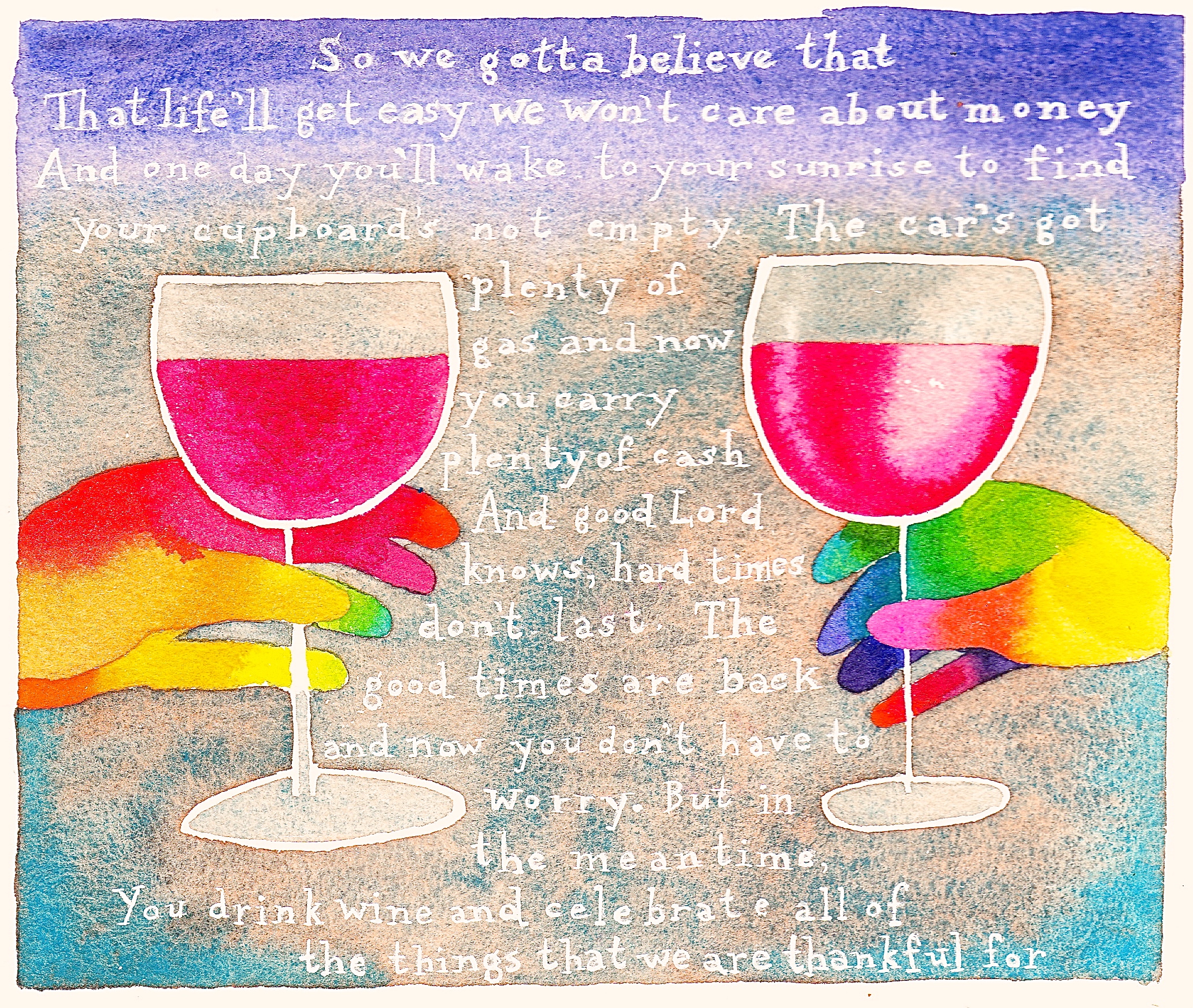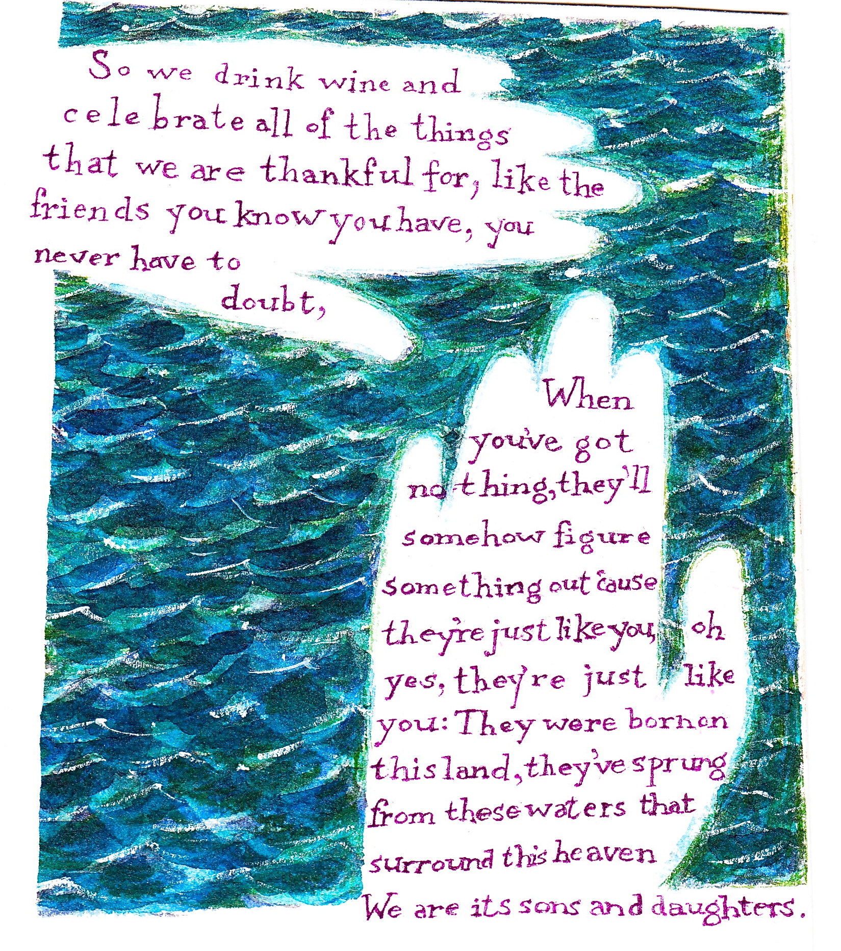 Here are the illuminated lyrics to a song called “Small Town,” written by my friend Blake Elliott. You can listen to the song here. Blake’s first CD was released in November. Her band is called “Blake Elliott and the Robinson Affair.” You can listen to 5 songs from the CD here. Okay, here are the lyrics: