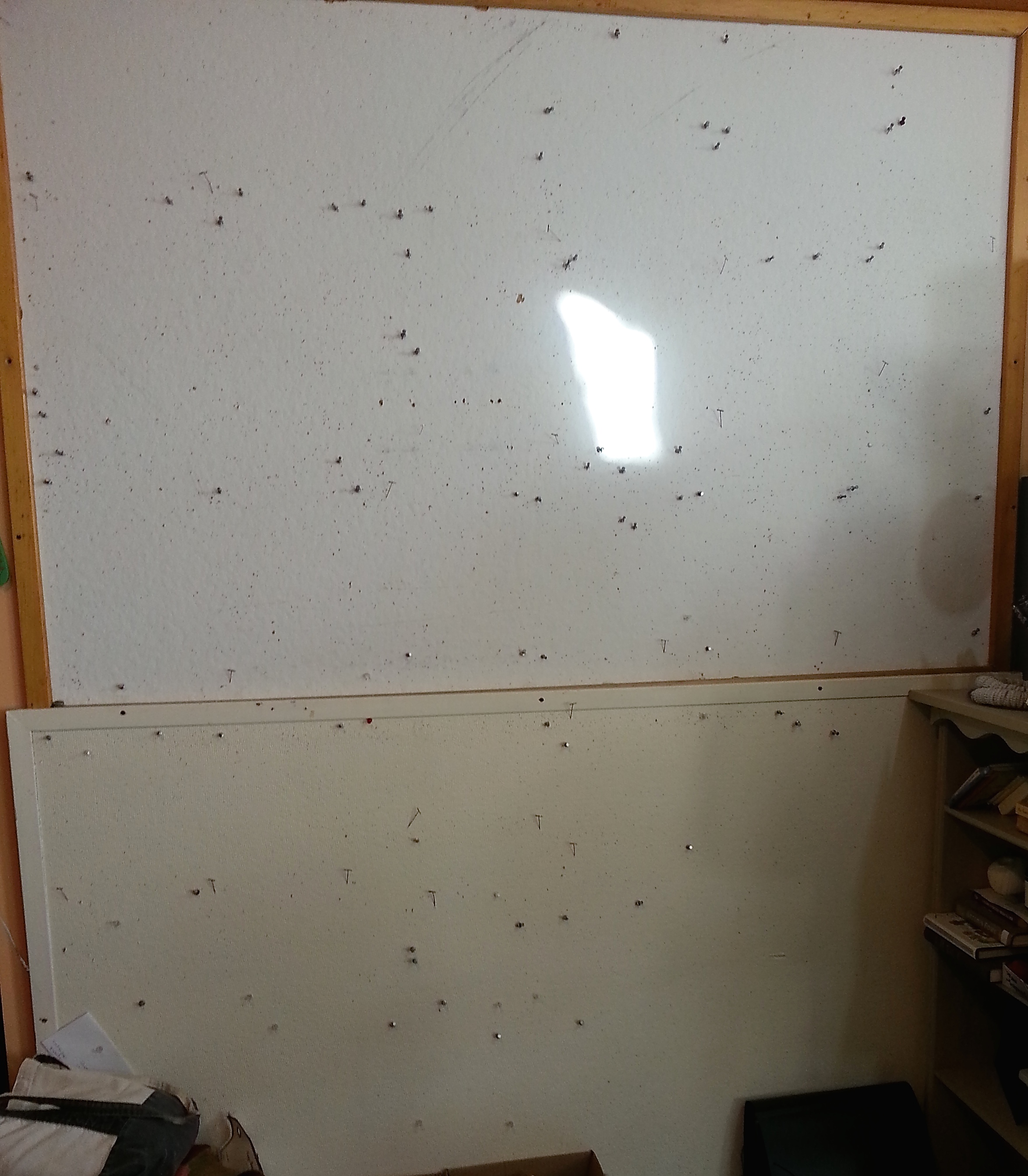 One day while I was working on a table nearby, I looked over and Hazel was collaborating on one of the watercolors near the bottom by licking the paint (it’s watercolor. Water soluble.) from the middle of it. I was able to restore it, but that’s why there is a pile of stuff stacked in front of the paintings — to keep Hazel away. Here is what the bulletin board looks like now that I’ve sent the paintings away: