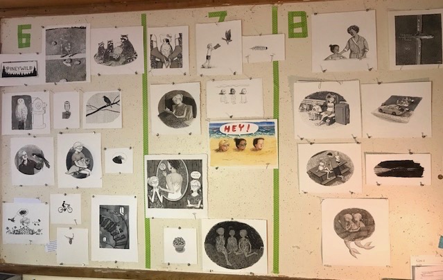 Two of the walls in my studio are bulletin boards. When I’m working on a book, the bulletin boards fill up, bit by bit, with the illustrations. As they do, I feel myself living in the world they create.