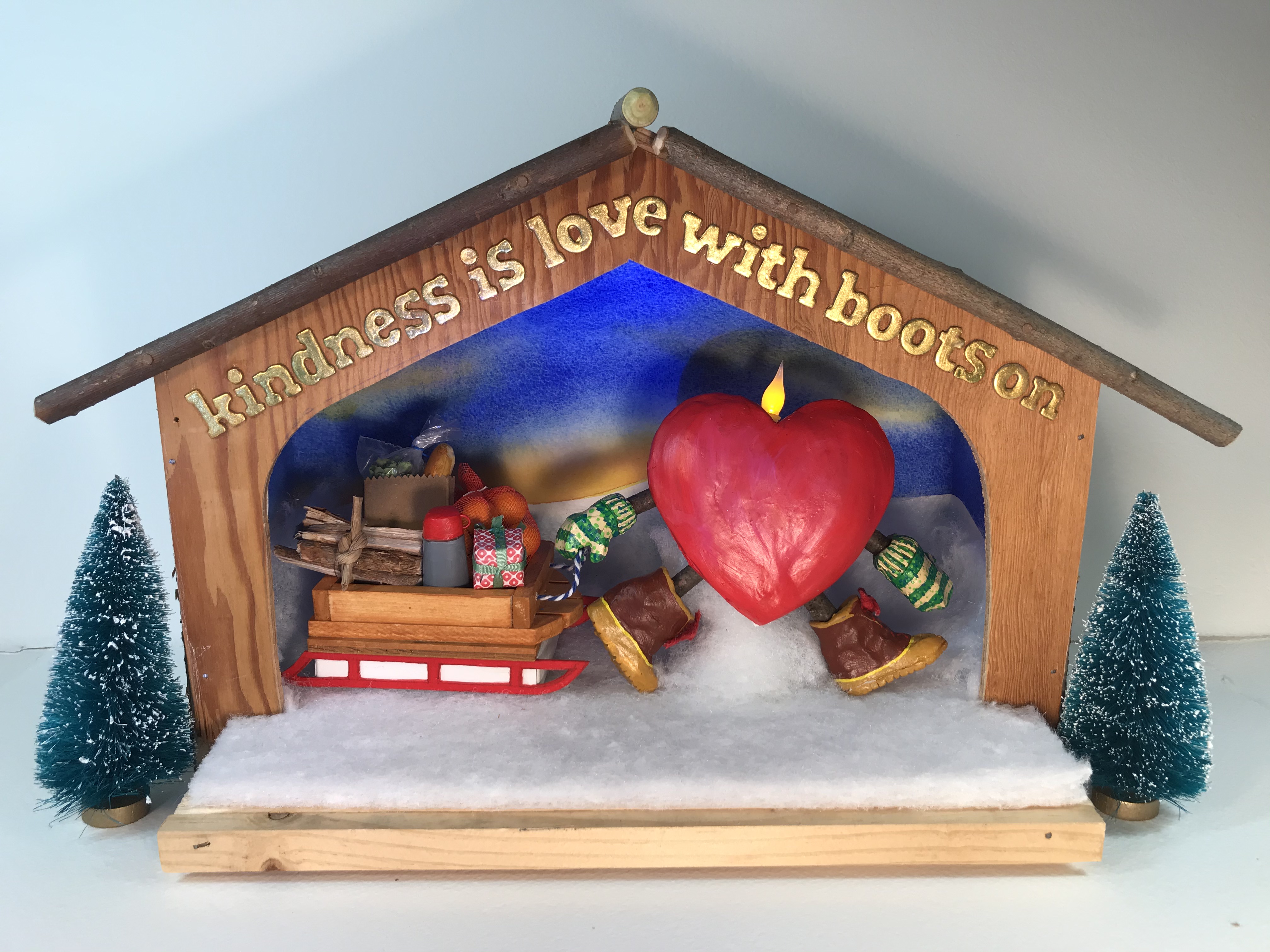 I’ve been making some 3-dimensional work this year (including dioramas! picture book coming in May of 2021), and I decided to make a little wayside shrine for our Christmas card. An InstaShrine, if you will. It’s not really suitable for outdoor placement. Aside from the cottony “snow” which would become InstaSoggy, the little light is a battery-operated votive, which would soon be InstaBurnedout.