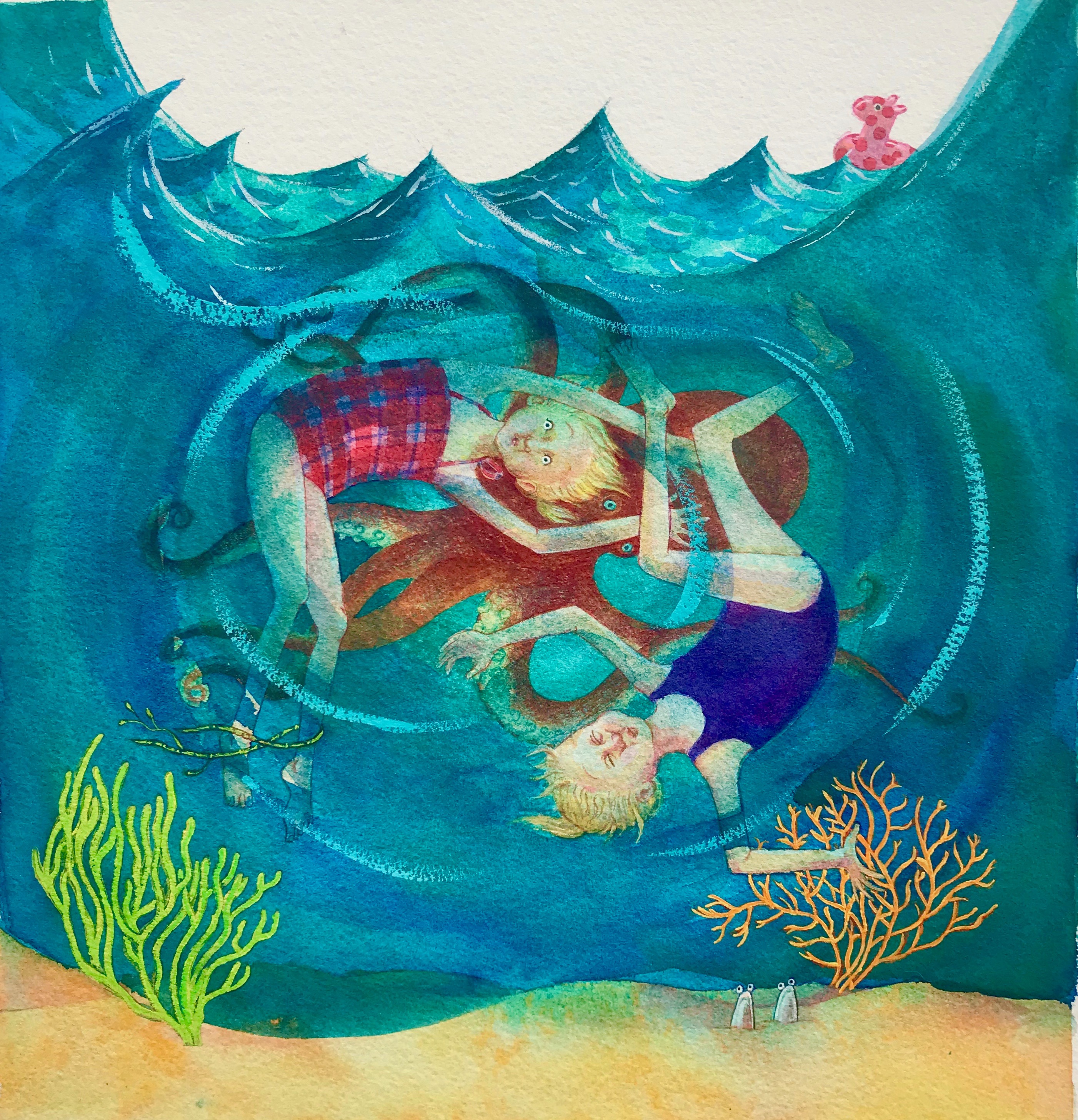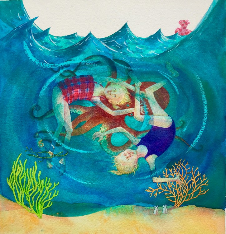 Secret Sisters of the Salty Sea grew, as many books do, from a few little seeds. In this case the seeds were blog posts that I drew and wrote, loosely based on memories of my family’s annual vacations to the seashore when I was growing up. See the giant bug and travel and jellyfish. (I thought there was one more, but I can’t find it.)