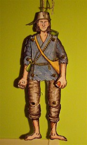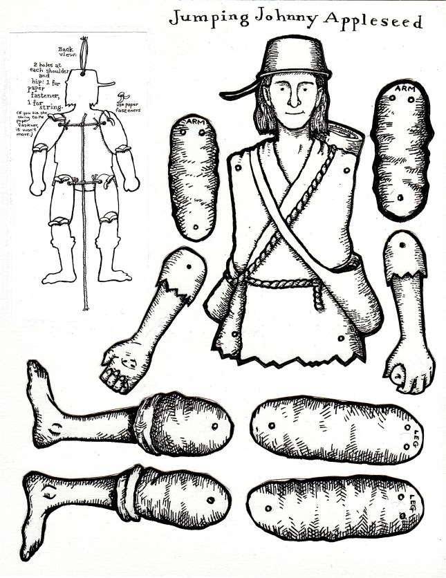 Children in the days of Johnny Appleseed did not have a lot of actual toys. Someone might carve them a “jumping jack” toy out of wood, sort of like this one, which is made of paper. It’s joined together with brads (paper fasteners). Separate holes are connected with string, and when you pull on the string, Johnny dances! Here is a pic of Johnny taking a break between songs: